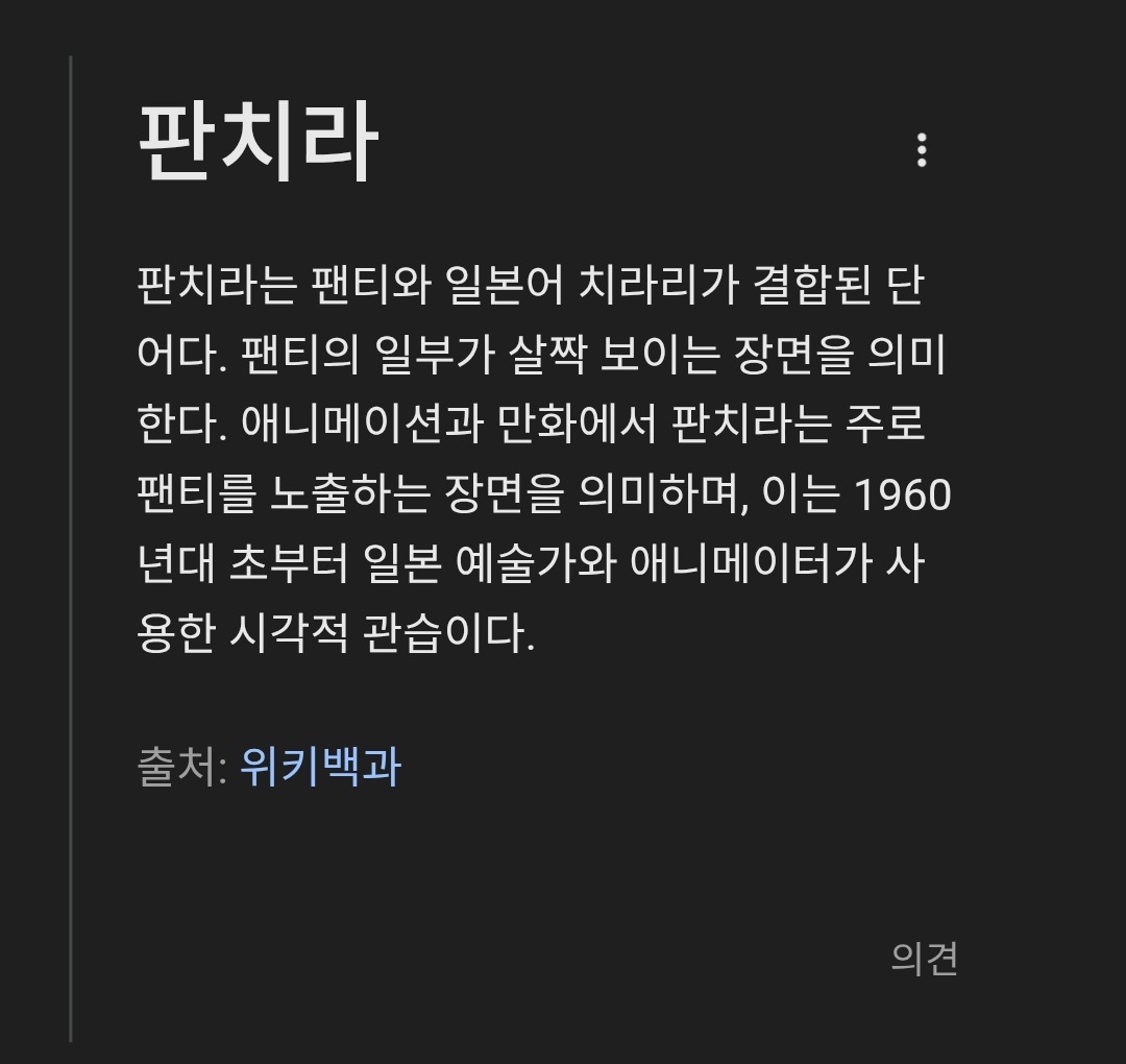 그런 '판치라 까지만' 정도가 본문과 반대로 판치라를 작품 수위에 맞춰 사용하는 케이스지. 업계에선 본문의 해석과 정 반대로 판치라가 오히려 성적인 수위 면에서 '노골적이지 않고 아슬아슬한 거' 쪽에 해당함. | 25.11.27 12:10 | | |