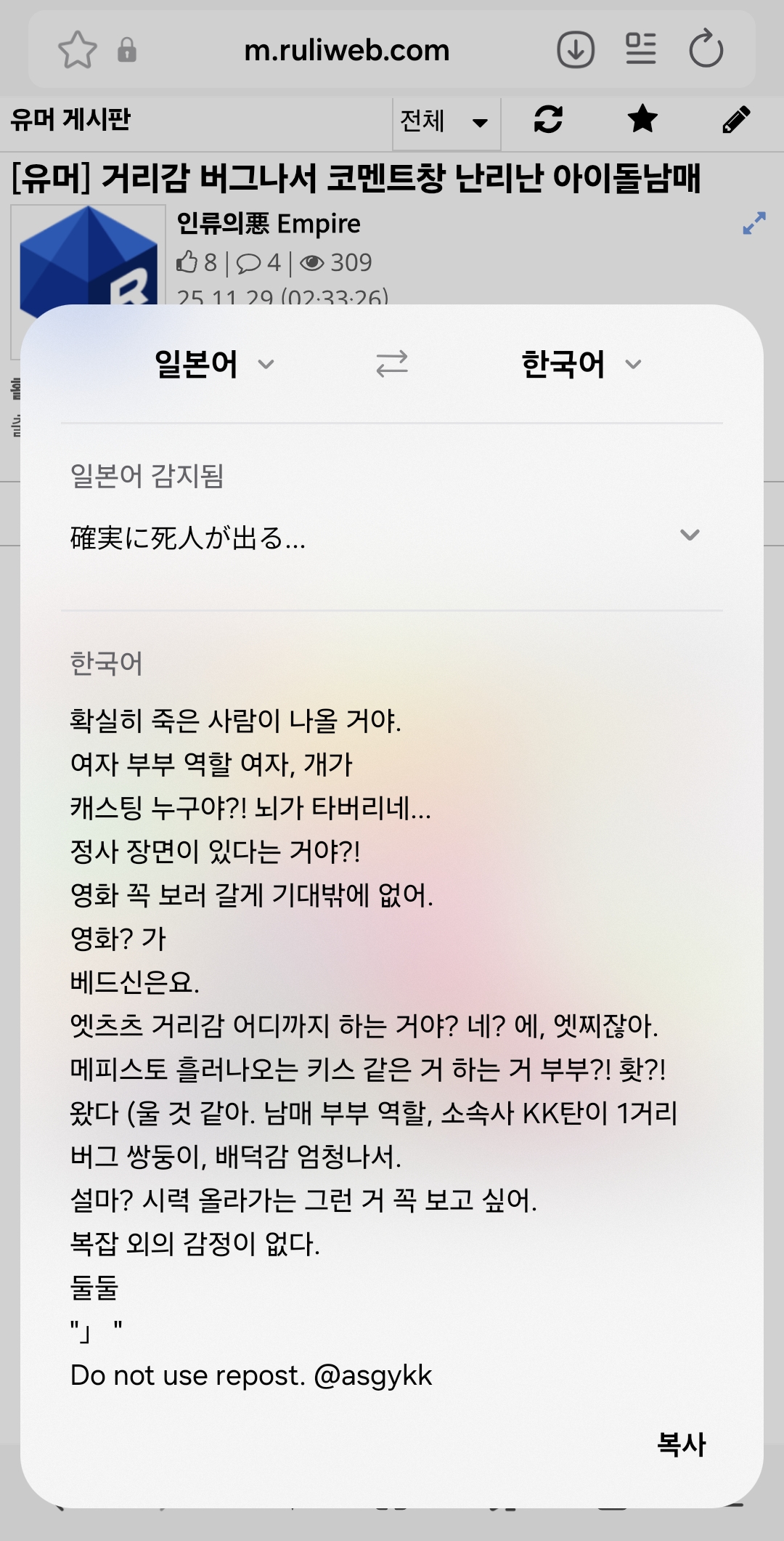 | 12645102 | 도쿄대생의 지하아이돌 후기 (23) | 긍정적인 사람 | 45 | 8990 | 02:49 |