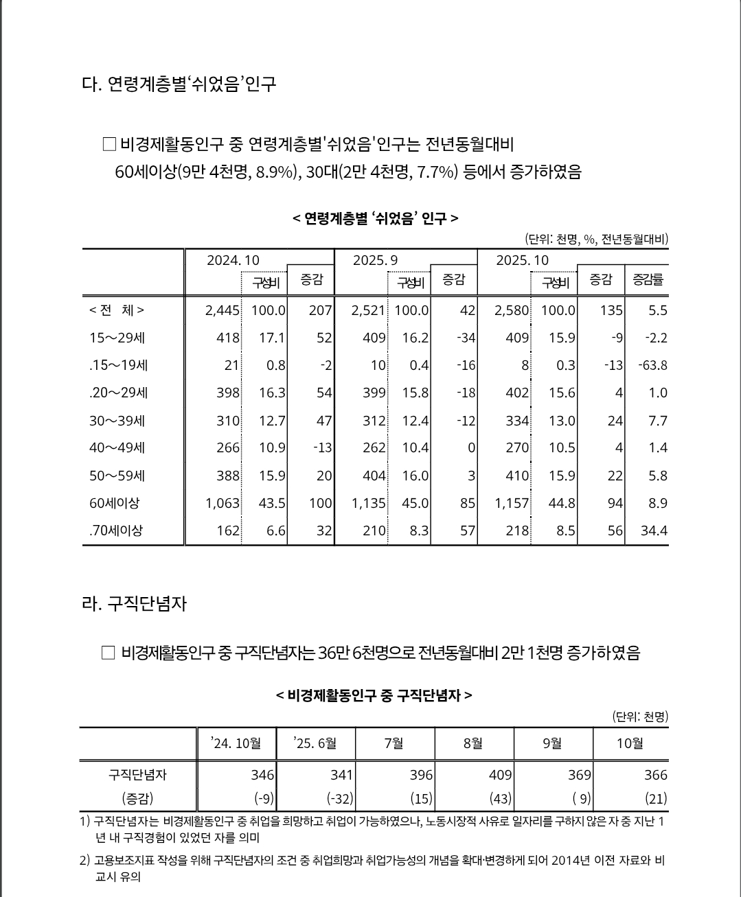 구직단념자는 구직 멈춘지 1년 되는 날까지 집계함. 그 이상 넘어가면 인적 자원 관점에서 이미 너무 오래 지났다고 봄 | 25.11.29 16:51 | | |