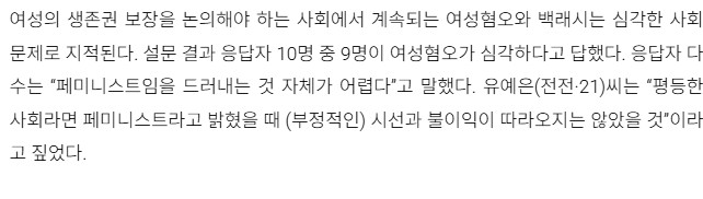 엄밀히 말하면 다수가 아니다 라기 보단 나는 페미니스트다 라고 드러낼 수 있는 사회가 목표로 보이는 글이긴 함 | 25.11.29 19:59 | | |