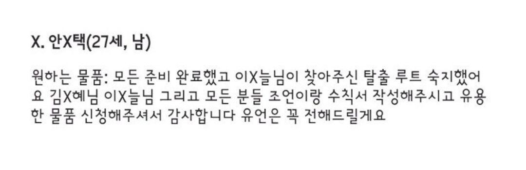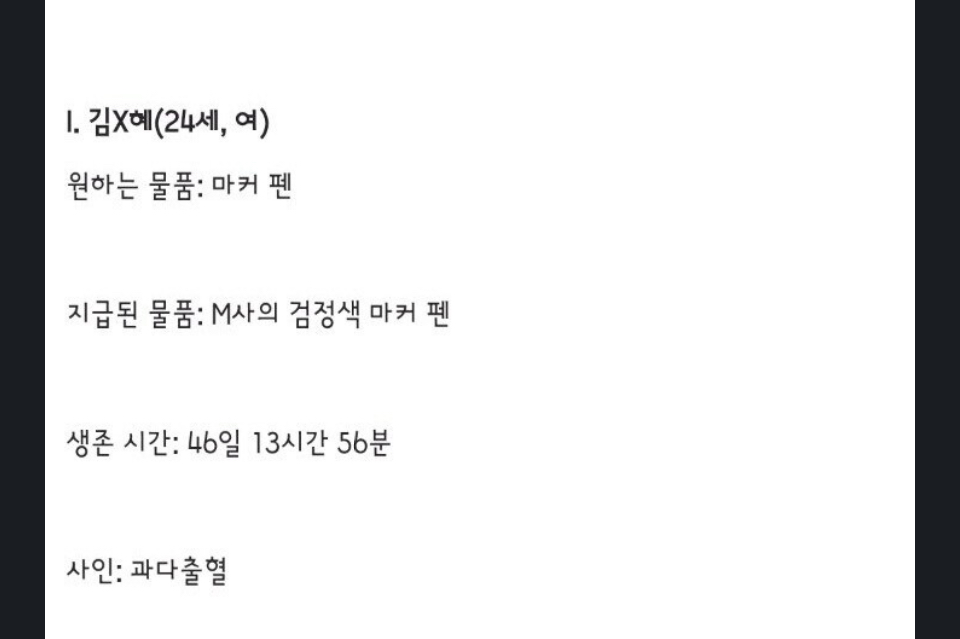 Z. 유x이(48세. 남성) 생존시간 : 1일 결과 : 탈출 성공 | 25.11.30 02:03 | | |