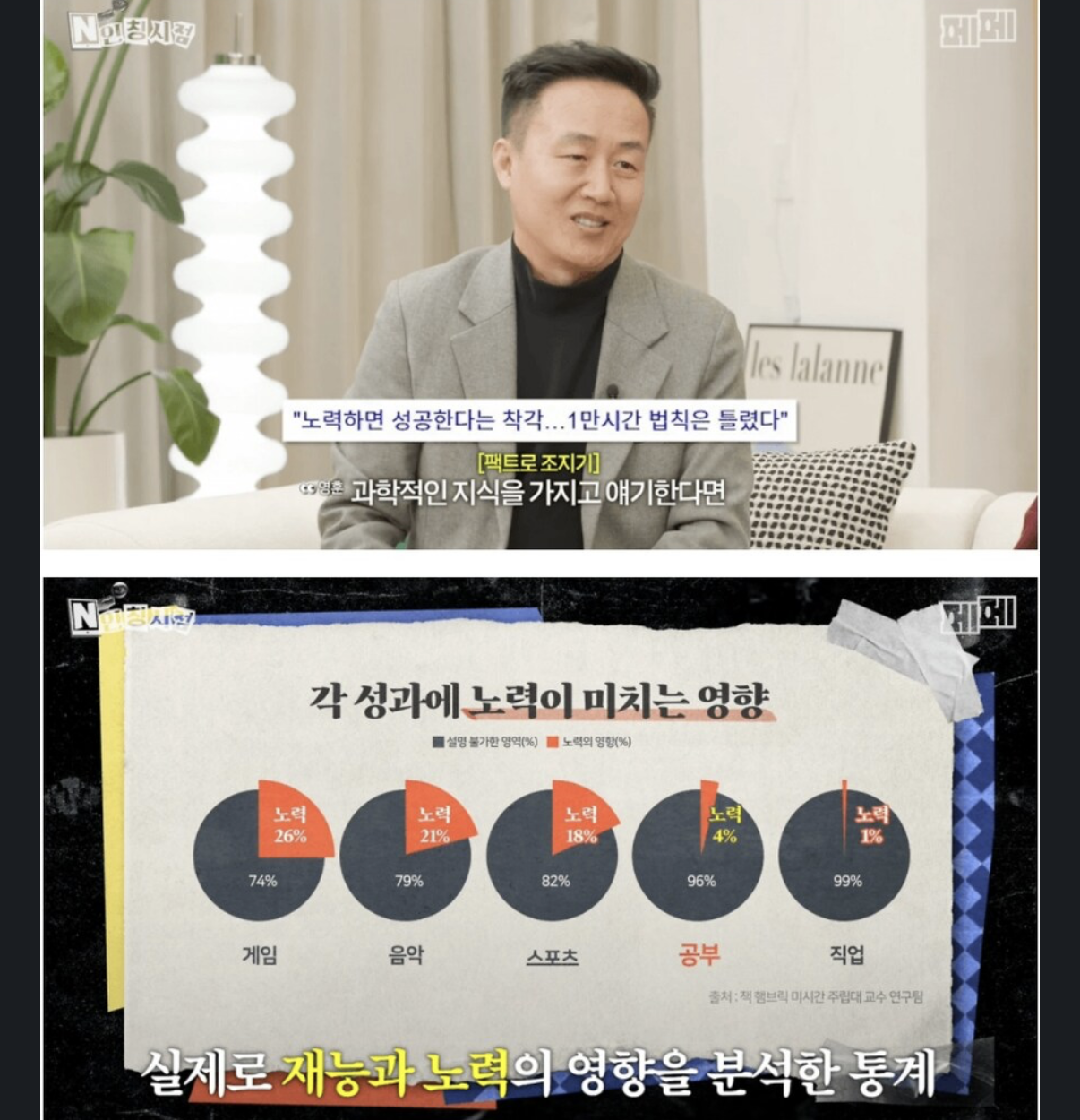그래프는 노력과 나머지 알 수 없음인데 나머지 알 수 없음이 전부 "재능"인 것처럼 말하는건 왜곡인 것 같음. 운, 가정환경 등등 재능 말고도 변수는 많을텐데.