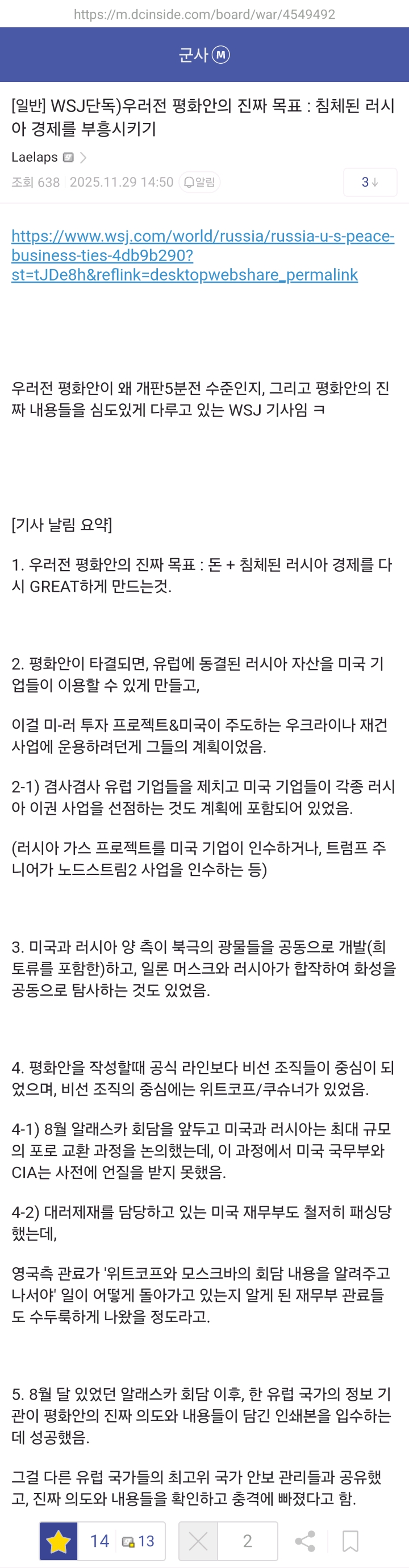 여기에 대한민국 UN 탈퇴, 공동방위조약 금지까지 넣어야 지금 우크라이나가 강요받고 있는 종전이 완성됨. | 25.11.30 13:57 | | |