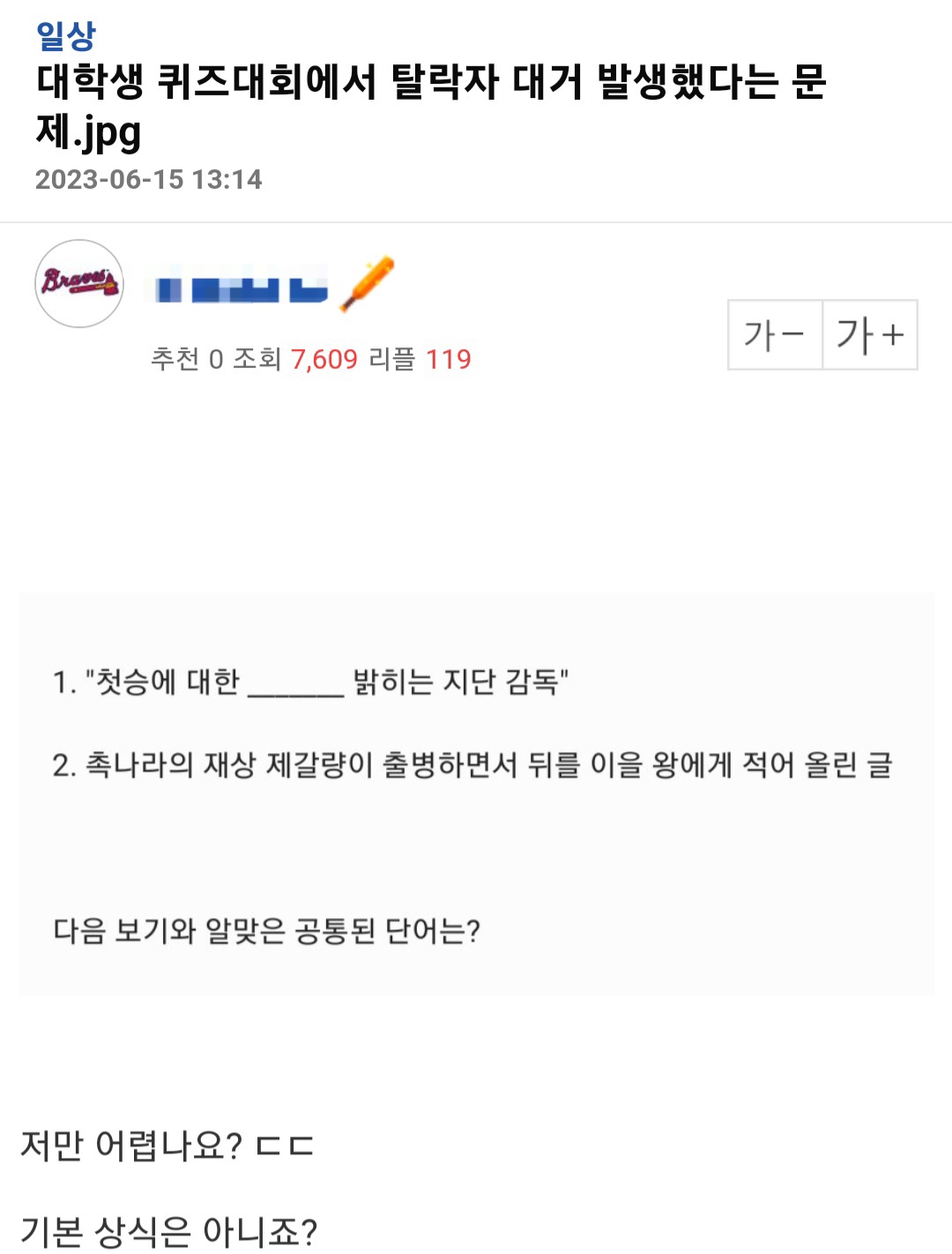그건 아래 출사표가 있으니 그에 어울리는 표현이면 누가봐도 포부네 한거고 각오도 맞지 전후관계 뒤집어 생각하면 소감도 맞고 여튼 저 퀴즈대회가 뭔지는 모르지만 오프라인으로 골든벨마냥 진행한거면 출사표가 뭔지 정확히 아는 학생의 경우 1번 보고 포부? 소감? 각오? 했다가 2번 보고 아니 출사푠데 다시 1번 보고 아니 출사표가 아닌데? 다시 2번 보고 아니 출사표 맞잖아 아니 이거 뭐야 함정퀴즈인가? 하고 오프대회 영향으로 긴장빨며 생각이 너무 많아져 틀렸을 경우도 꽤 있을 것 같음 애초에 출사표는 내다 올리다 제출하다로 표현해야 하는 단어이고 던지다는 관용어로 자리 잡은거고 출사표를 밝히다는 진짜 아님 쓰긴 한다고 한 것도 출사표가 뭔지 모르고 잘못쓰는 경우가 있어서 쓰긴 한다고 한거지 잘못된 표현인건데 그 잘못 사용하는 경우를 문제로 낸거임 | 25.12.02 03:09 | | |