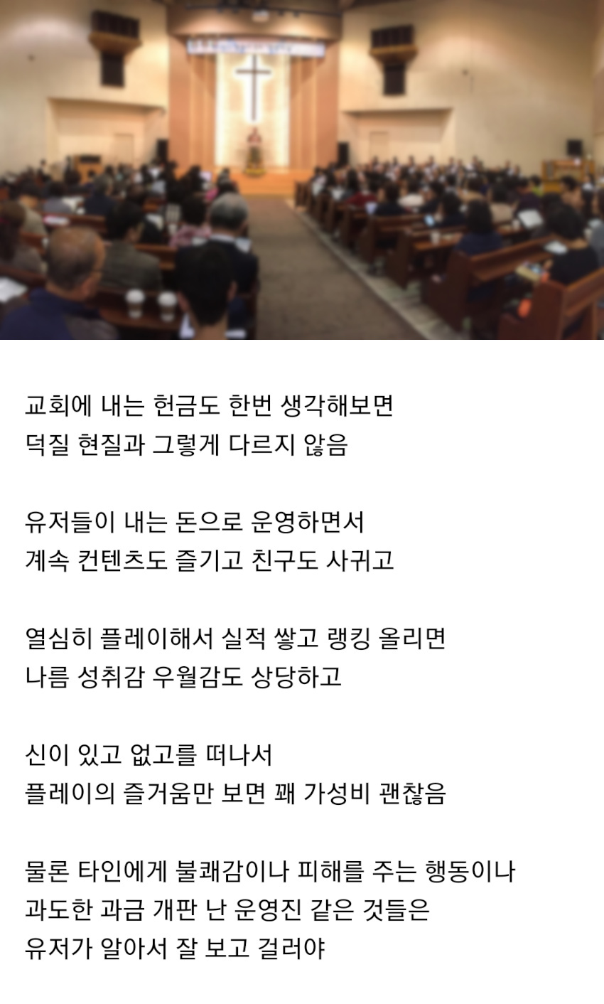 교회하는 커뮤니티 운영비용이기도 하잖아... 그렇게 모은 돈으로 내부 행사도 하고 기부도 하고 봉사활동도 하기도 하는데 너무 안 좋게 보지는 말자...