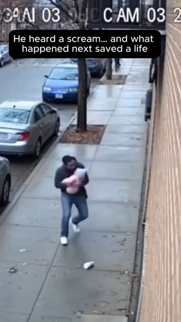 남자가 길가다가 창 밖으로 떨어지는 아이를 구조