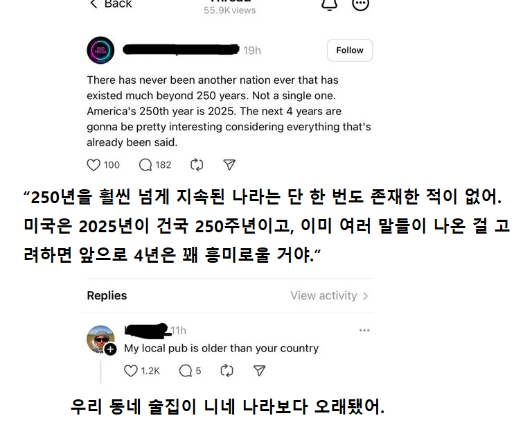 니네 나라보다 역사가 짧은 나라보다 역사가 긴 나라가 수두루빽빽이다. 하다못해 남아공의 역사가 케이프타운부터 시작한다고 쳤을때 미국보다 오래되었는데