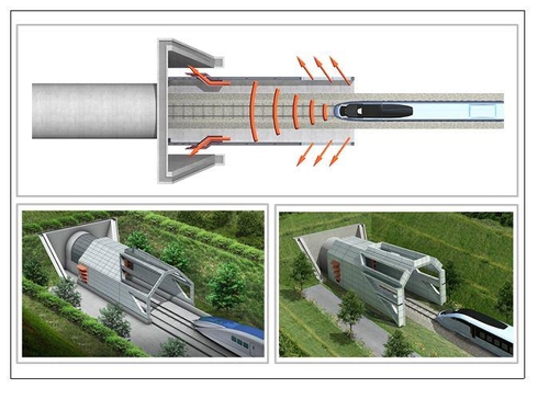 대충 설명 하면 기차가 터널 지나면서 전방의 공기를 압축하다가 터널 끝에서 빵 하고 폭발음이 터지는 현상을 막는 구조물임 울 나라는 ktx를 늦게 들여와서 터널마다 저런 구조물이 다 걸치 되어 있는데 일본은 세계 최초로 신칸센 놓을 적에는 저런 구조물을 일일이 다 설치하지 않아서 기차 주둥이를 길게 늘이는 식으로 터널 끝 폭음을 줄였다는 뭐 대충 그런 얘기