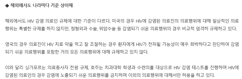 이게 당장 18년도 기사인데, '과학적으로' 따지자면 전염확률이 거의 없기 때문에 진료하는 건 문제 없고, 따라서 해외마다 기준을 두고 '여기까진 문제 없습니다' 하는 경우가 많음. 문제가 되는 건 '과학적 사실' 이 아니라 "이래도 괜찮아?" 하는 '비과학적인 공포' 에서 온다 | 25.12.03 12:20 | | |