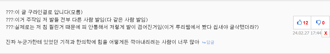 이 짤은 몇년 된거다만 본문에 저 글에 사진만 올라왔을때 한의학을 깍아내리려는 아무말 대잔치하는 ㅄ들 존나 많았다지? 이렇게 전체 글이 올라온 다음에 싹다 버러우탔고 아직 정확한 증면이 어려울 뿐이지 누군가한테는 기적이었고, 많은 분들이 공부와 데이터 쌓기를 반복하고 있는 한 학문을 방구석에서 ㅈ도 모르는 ㅄ들이 깍아내리려는 인간들 존나 많더라