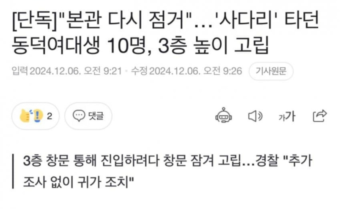 저거 희대의 병1신똥틀임 이벤트였지 ㅋㅋㅋㅋ 사다리 내려가지도 못해서 문열어달라고 징징대는 와중에 본관 점거한다고 염병하는건 수치심이 결여된걸까 개념이 결여된걸까 진짜 신기방기했어 ㅋㅋㅋ | 25.12.04 08:45 | | |