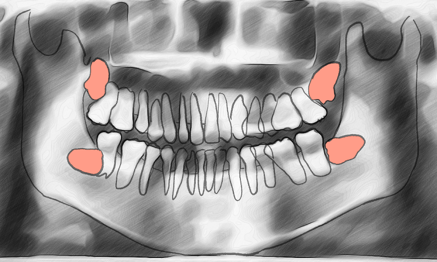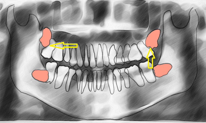 작성자가 그린 그림이 실제 엑스레이를 반영한다면 실제 잇몸라인은 여기서 붉은색 라인에 가까움 그러면 4개 사랑니가 모두 잇몸 안쪽에서 완전매복상태라 성인 기준으로 더 이상 성장가능성이 없다면 안뽑아도 됨 일부가 잇몸 밖으로 드러나는 경우에 맞닿은 이가 썪는거고, 밀린다는 얘기도 성장기에나 적용되는거라 작성자가 완전성인인 경우엔 특별한 사정이 없다면 뽑지 말라고 할걸 | 25.12.04 20:28 | | |