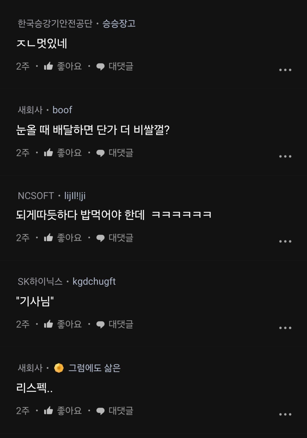 더 줌 많이 더 줌 택시 생각하면 됨 눈 많이 올 때 택시 타면 미안하다고 생각 안하잖슴 운전 안 할 택시기사는 진작에 집 들어가서 쉬고있고 눈 와도 할 사람만 하는거임 심지어 택시는 기상할증도 없음 배달은 기상할증 낭낭하게 붙고 눈, 비 와서 위험하니 미안해서 못시키겠다 하는 생각은 안해도 됨 걍 이 날씨에 정상적인 서비스 제공받는 편리함에 감사하기만 하면 됨 | 25.12.05 02:41 | | |