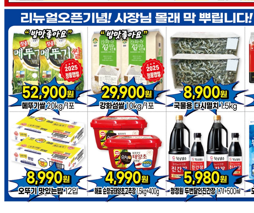 새로 오픈한 식자재 마트인데 오픈 행사만 2달 넘게 하고 있음 ㅋㅋㅋㅋㅋ 초반은 진짜 혹할만한 미끼 상품이 많이 보였는데 이젠 힘이 다 빠졌는지 호들갑 상품이 저 정도임. | 25.12.05 11:29 | | |