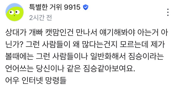 그렇게 뼈때리는 말하니 괜히 발끈해서 짐승이란 말에 꼬투리 잡는 모습까지 ㅋㅋ | 25.12.05 15:59 | | |