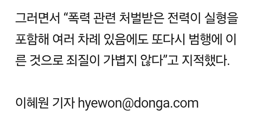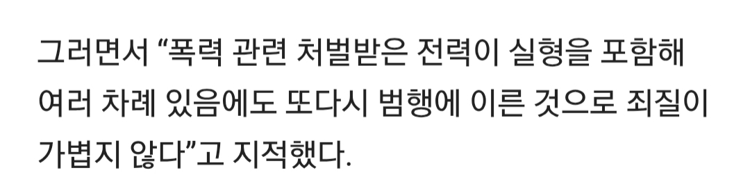 그러면서 “폭력 관련 처벌받은 전력이 실형을 포함해 여러 차례 있음에도 또다시 범행에 이른 것으로 죄질이 가볍지 않다”고 지적했다. 그야... | 25.12.05 15:40 | | |