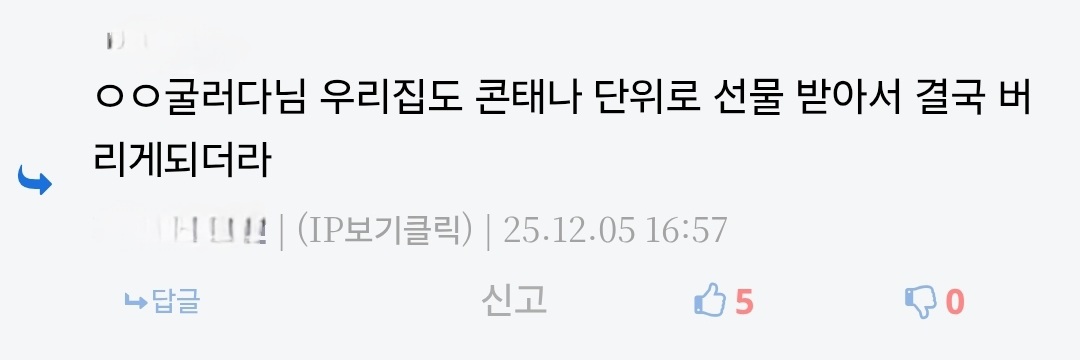 ㅇㅇ굴러다님 우리집도 콘태나 단위로 선물 받아서 결국 버리게되더라 | 25.12.05 16:57 | | |