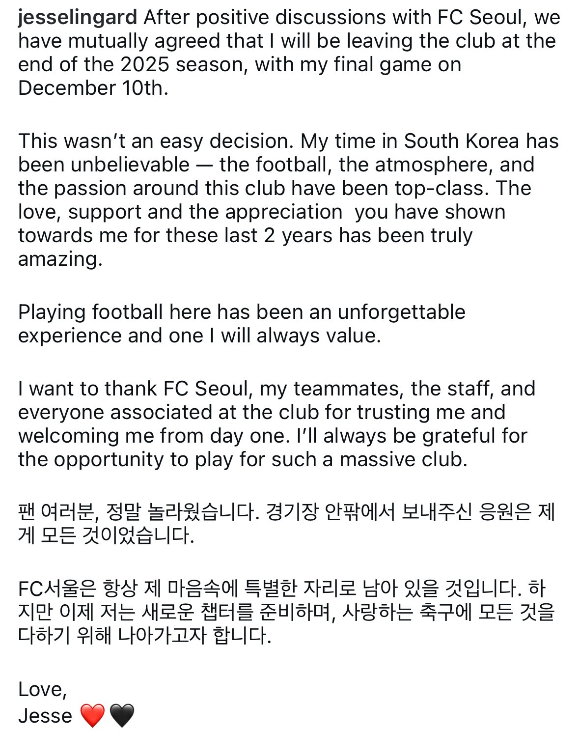 이는 쉬운 결정이 아니었습니다. 한국에서 보낸 시간은 믿을 수 없을 만큼 특별했습니다. 축구, 분위기, 그리고 이 클럽을 둘러싼 열정은 최고 수준이었습니다. 지난 2년 동안 여러분이 보여주신 사랑, 응원, 그리고 격려는 정말 놀라웠습니다.