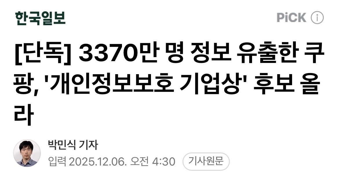 아 물론 만약에, 나중에, 여기서 상 받은 거로 (어디서 왜 상 받았는지 밝힐 수 없지만) "쿠팡은 개인정보보호법을 지키는 착한 기업이다-!" 하고 빨아제끼는 기사가 나올지는 별개임ㅋㅋㅋ | 25.12.06 08:31 | | |