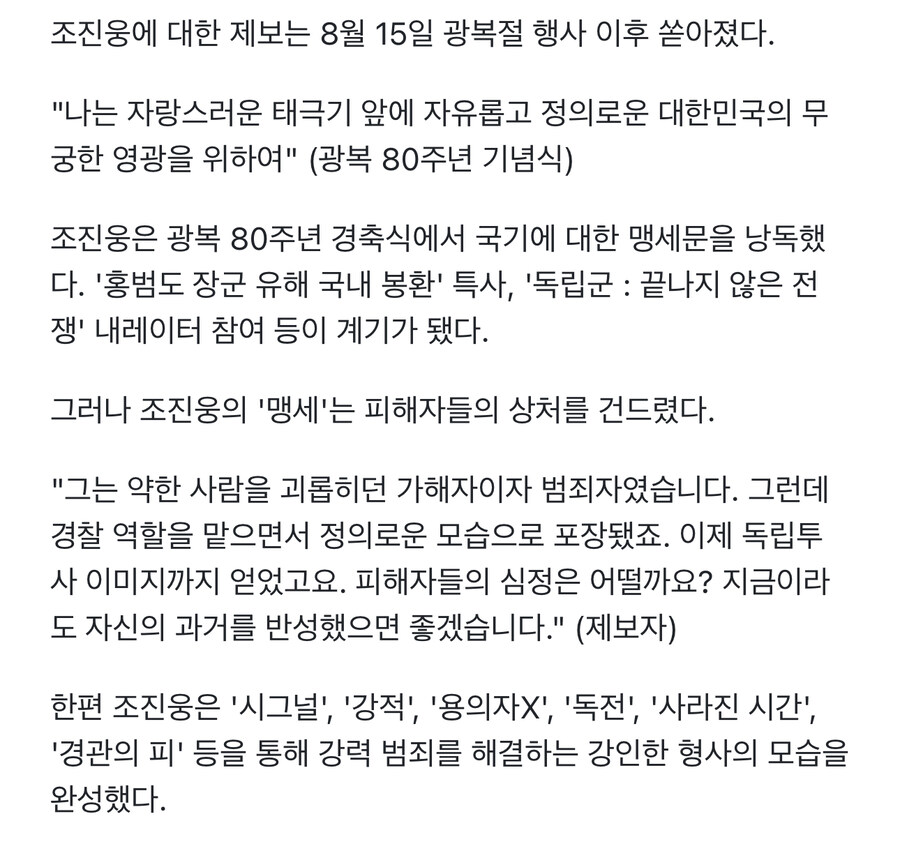 그동안 소문은 있었는데 묻혔음 그러다 광복절 행사 때 대표로 국기에 대한 맹세 하는거 보고 위선적인 모습 도저히 못 봐주겠다며 제보 쏟아졌다 함 | 25.12.06 09:25 | | |