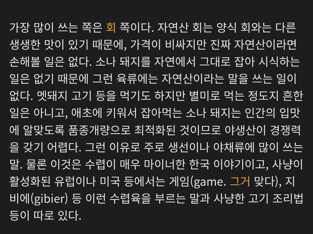 내가 강원도 산간쪽에 살아봤고 지금도 종종가서 맷돼지랑 꿩, 고라니도 종종 먹어봄 근대 아무리 잘 조리해봐도 양식쪽이 더 맛있더라고요, 야채나 과일도 그 향을 즐기는 나물아니면 재배한쪽이 압도적인부분이 있고요. 생선은 애초에 양식하는 어종이 되게 한정적이라 비교가 안될꺼같아요. 여긴 양식은 양식이 더 맛있는거 아니면 잘 안들어오는편이거든요, 안들어오는거 예를 들면 양식 돌돔같은거요. | 25.12.06 19:32 | | |