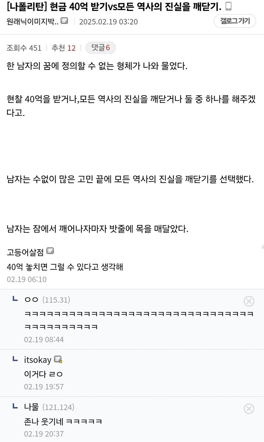 돈이냐 약간 적은 돈 + 명예 + 지식이냐 | 25.12.11 09:20 | | |