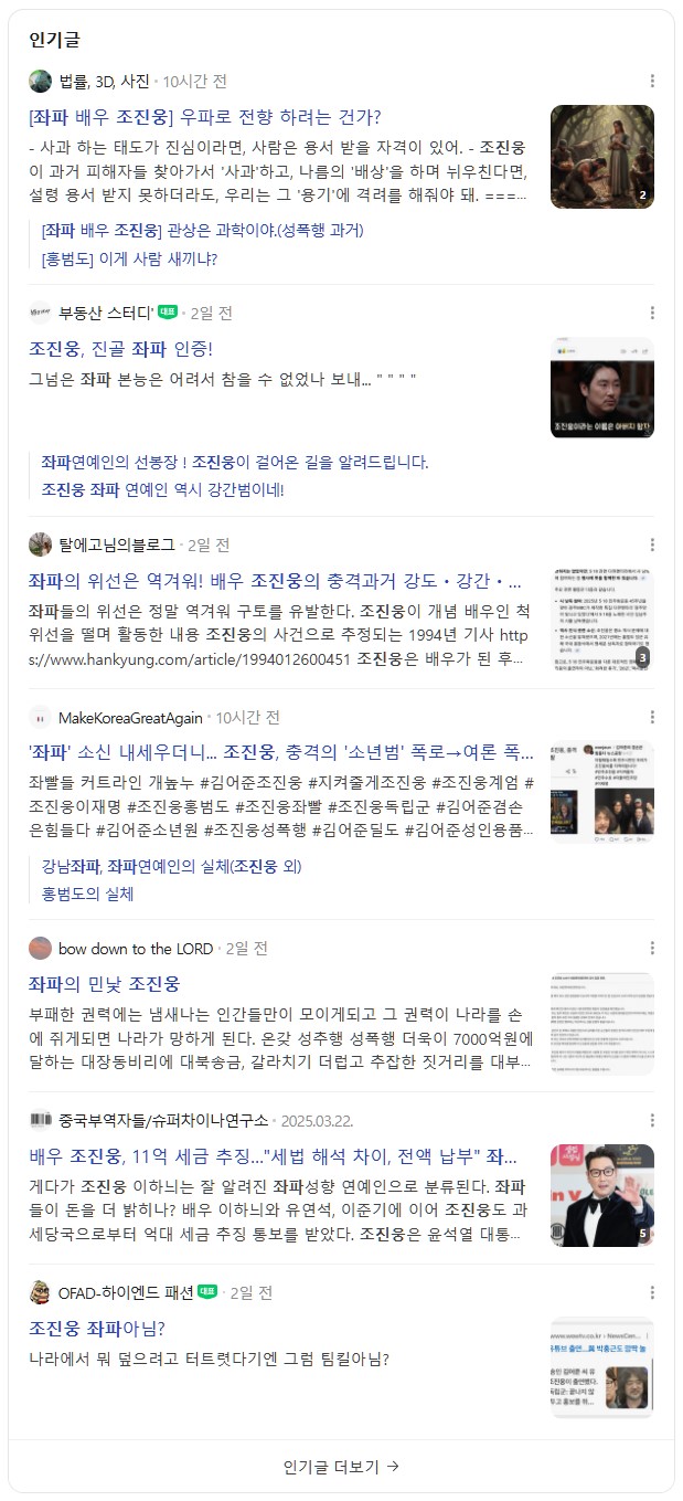 에휴 ... 페미 극혐하는데 어따 페미를 비비시는건지.... 그냥 전체적인 현상을 글로 적은건데... 루리웹 말구 보배나 네이버도 가봐... 조진웅 놓고 지금 서로 싸우고 있구만... 난 조진웅에 대해서는 별다른 평가를 안 함... 이선균 사건도 있었고 뉴스 출처가 애매해서... 깔래면 더 확실해진 다음에 까야 한다는 입장임.. 이선균 선례도 있었고... | 25.12.07 11:47 | | |