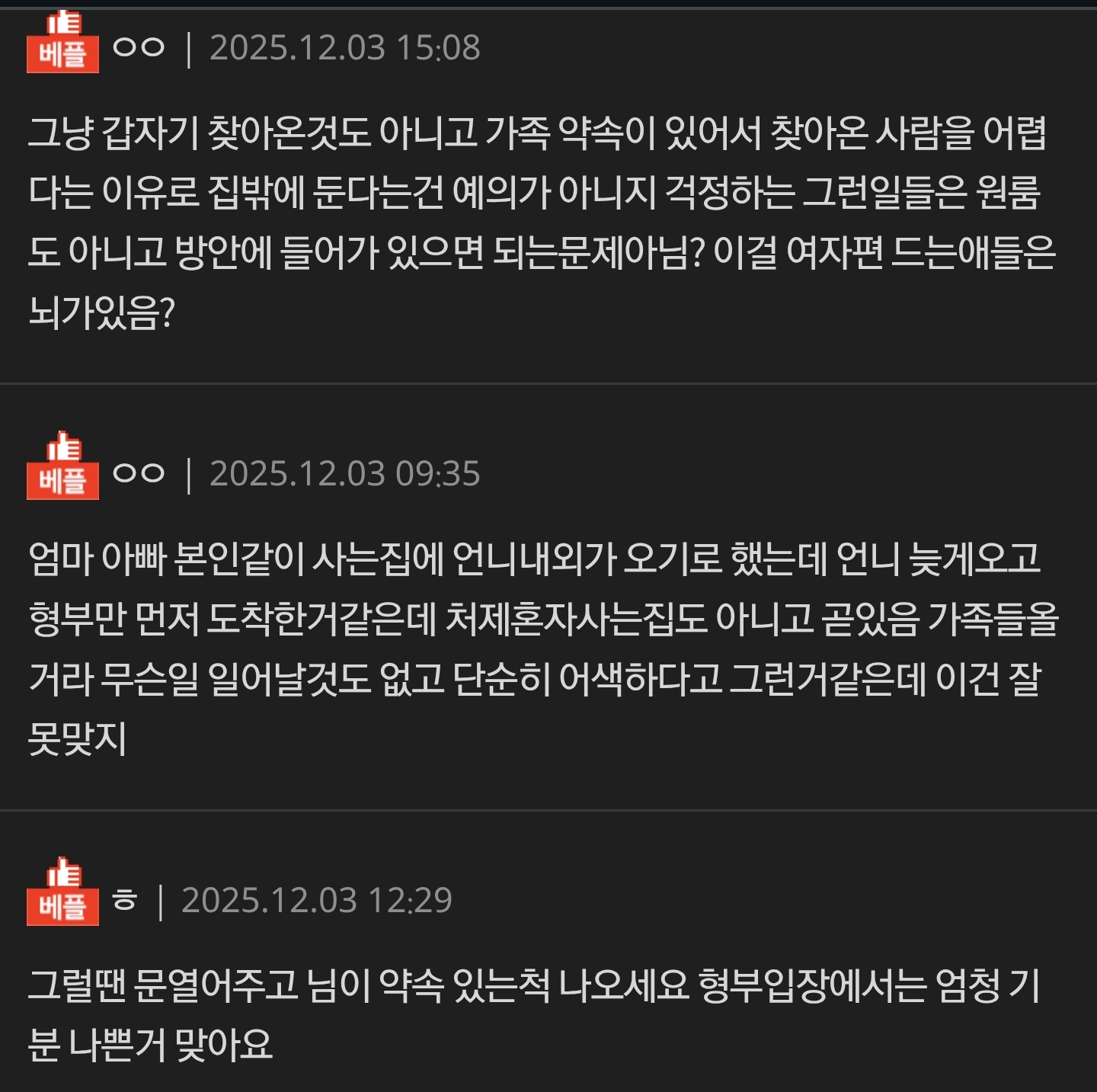 그건 자기 집인데 자기 알아서 할 일 형부가 가족이라고 하지만 집 안에 같이 사는 사람은 아니잖아 언니도 마찬가지고 | 25.12.07 20:52 | | |