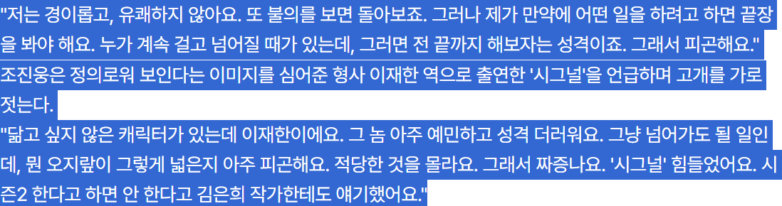 하지만 다른 주연 배우인 조진웅 만큼은 시그널 시즌 2의 제작 및 방영 계획과 이재한 캐릭터에 대해서 안 좋게 언급하고