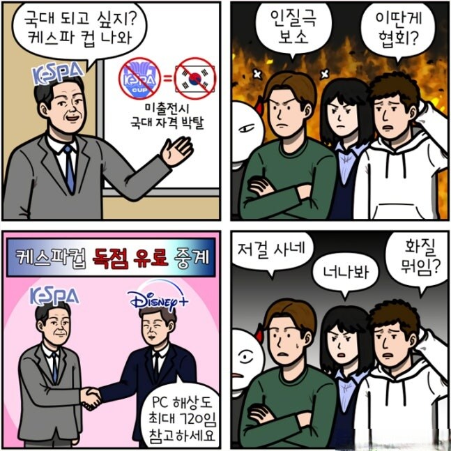 디플이야 뭐 늘 쓸 광고비 집행하면서 조금이라도 가입자 늘렸을 테니 불만 없을 거고(당장 나부터가 울며 겨자먹기로 가입하긴 함), 케스파 놈들도 어차피 위상 따위 쥐뿔도 없는 대회 위상 더 떨어질 것도 없는데 중계비 받았을 테니 개꿀 하고 있겠지 걔들 기준으론 둘 다 윈윈일 듯? | 25.12.08 16:27 | | |