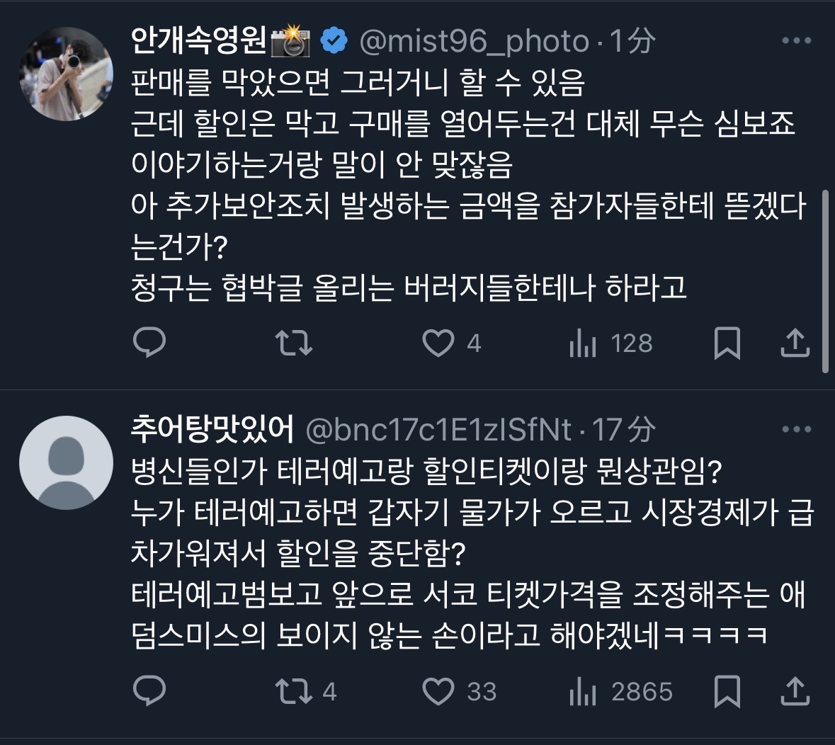 테러범 : 크흑 입장료가 너무 비싸서 테러를 하러 들어갈수가 없다아아 서코 추최측 통찰력 너무 강하다아아아