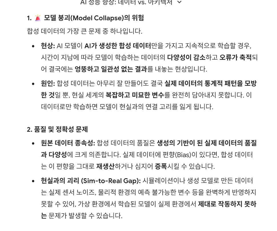 이것도 결국 ai 답변 받은거긴 한데 합성 데이터가 바로 내가 말한 문제가 나타날 수 있는 부분인거 아닌가 천재 공학자들이 다 답을 찾겠지만 아직은 완전한 대체제인건 아닌가본데 | 25.12.09 02:52 | | |