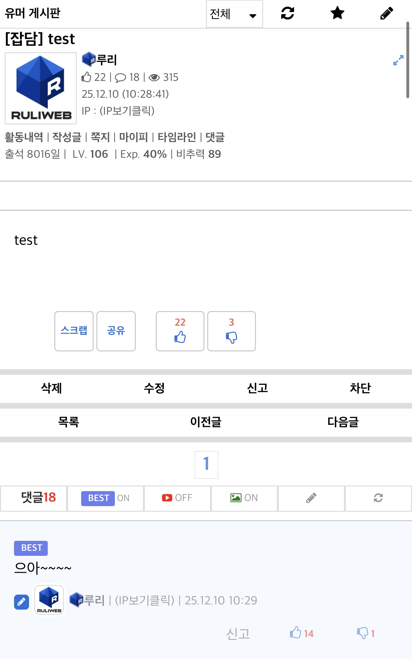 | 12687735 | 오늘 주간 루리웹 요약 (15) | 정킈 | 61 | 5880 | 25.12.10 |
