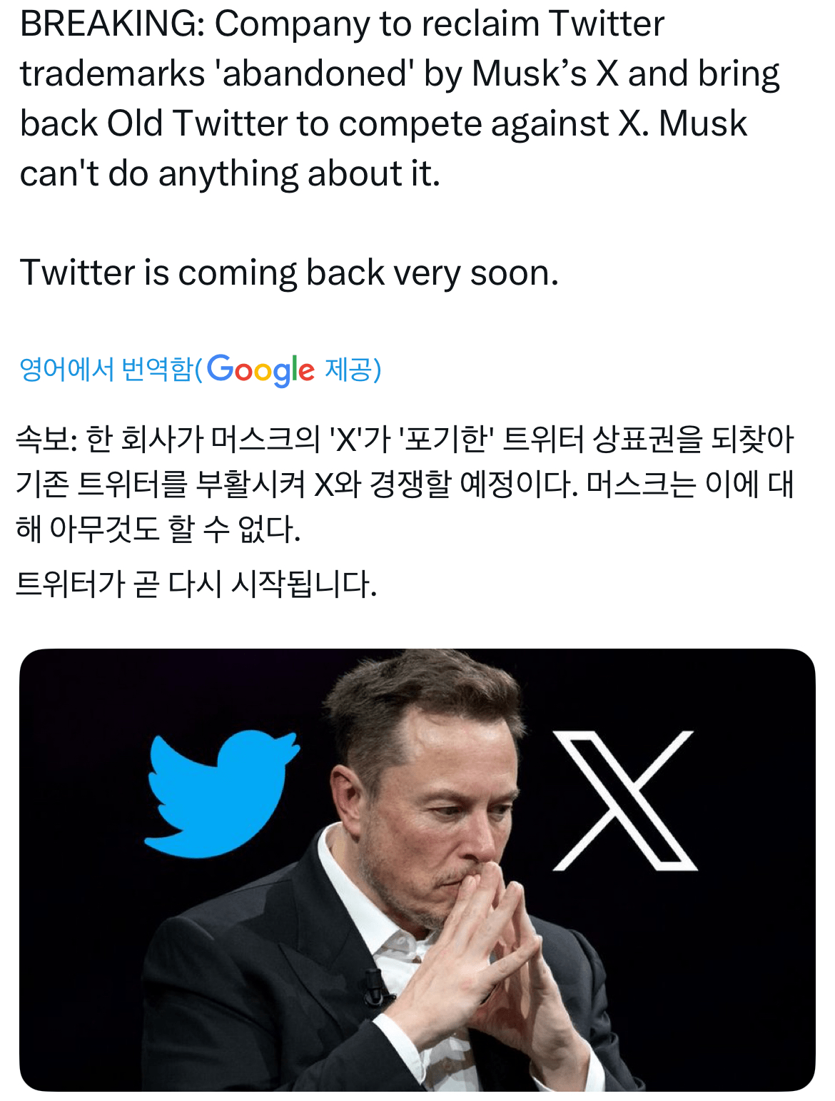 그러면 머스크가 새로운 sns인 트위터를 다시 사서 x로 바꾸면 되는 거 아냐?