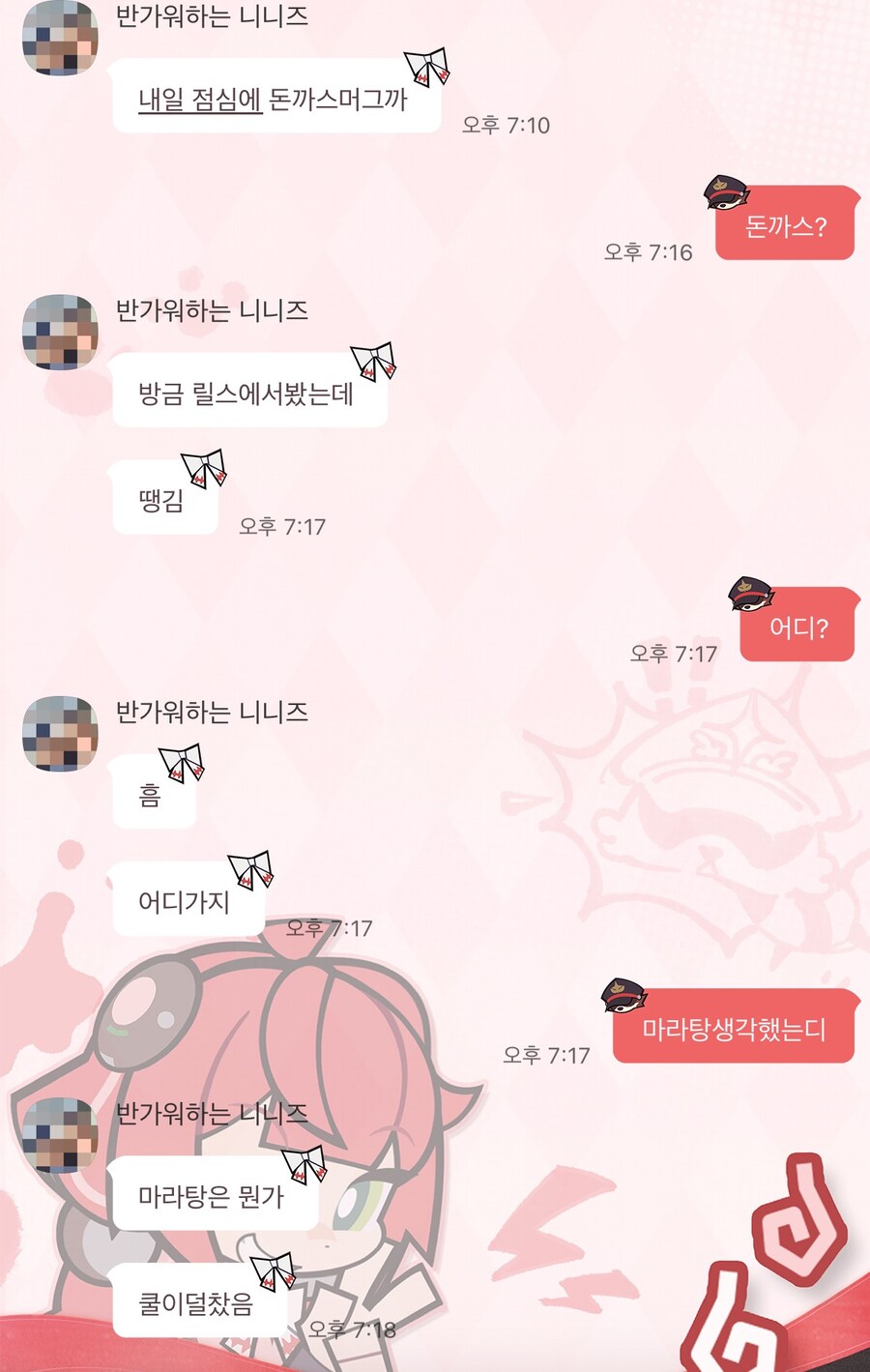 난 반대로 여친이 돈까스 먹자하고 내가 마라탕 먹으러 가자하는데 ㅋㅋㅋㅋㅋㅋ