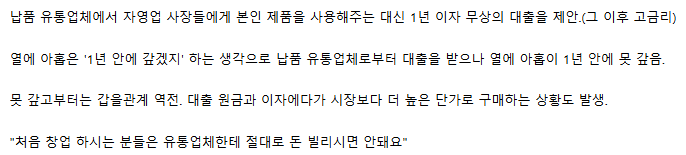 사실 저 주류대출 말고도, 요샌 프차도 저거 배워서 프차 본사가 대출해줌..고금리로... 이번에 제대로 걸린 그 무슨 갈비 체인이 저짓 하다가 욕쳐먹은 거지.. | 25.12.11 23:25 | | |
