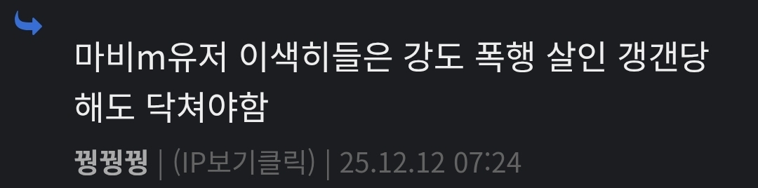 마비M이 잘못한 게 수두룩하다지만 이런 과격한 표현은 오히려 역공당하기 딱 좋아서 걸러야하는데;;;; | 25.12.12 07:27 | | |