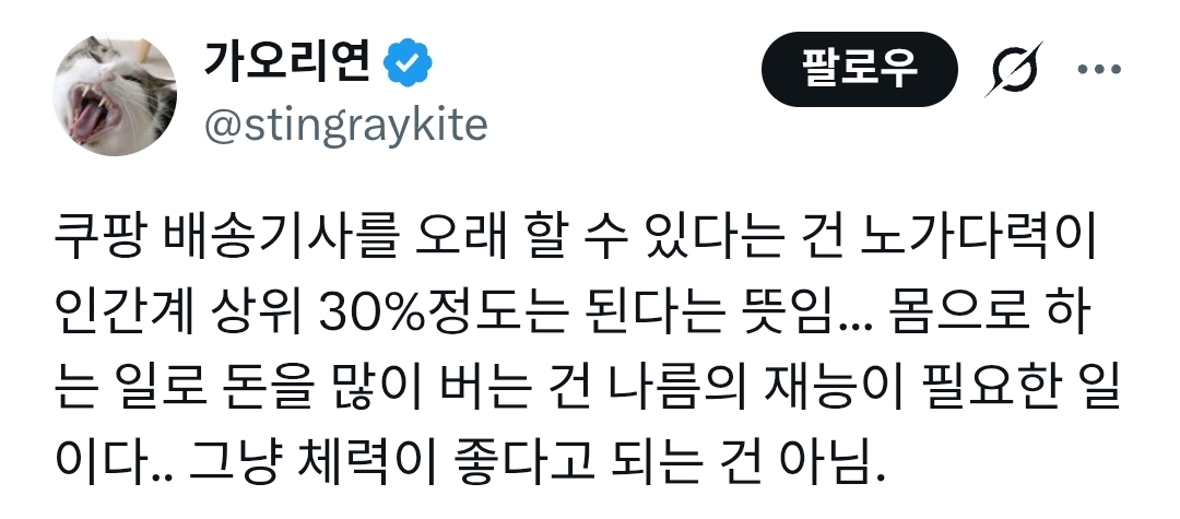 코로나때 택배하는분들 돈 많이 벌었다고 하는데 아침 7시에 나가서 밤10시에 들어와서 그런거였음.. | 25.12.13 13:16 | | |