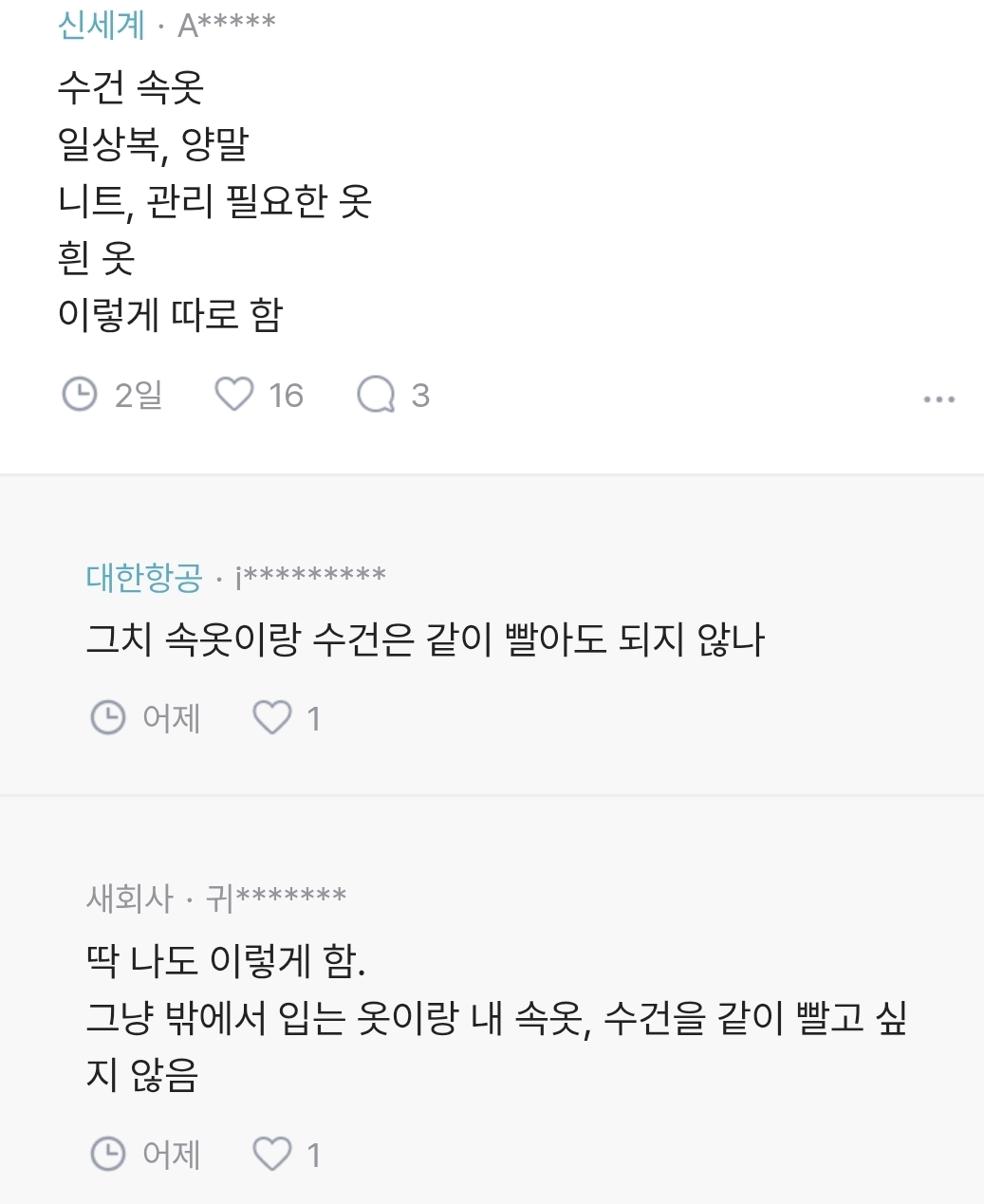 양말 정도나 이해가 가지 안에 내복을 입는 것도 아니고 속옷이랑 겉옷을 따로 빨 필요가 없음 애초에 세탁기에 뜨거운물에 건조 기능도 되는데 왜 불편하게 사냐? | 25.12.13 14:46 | | |