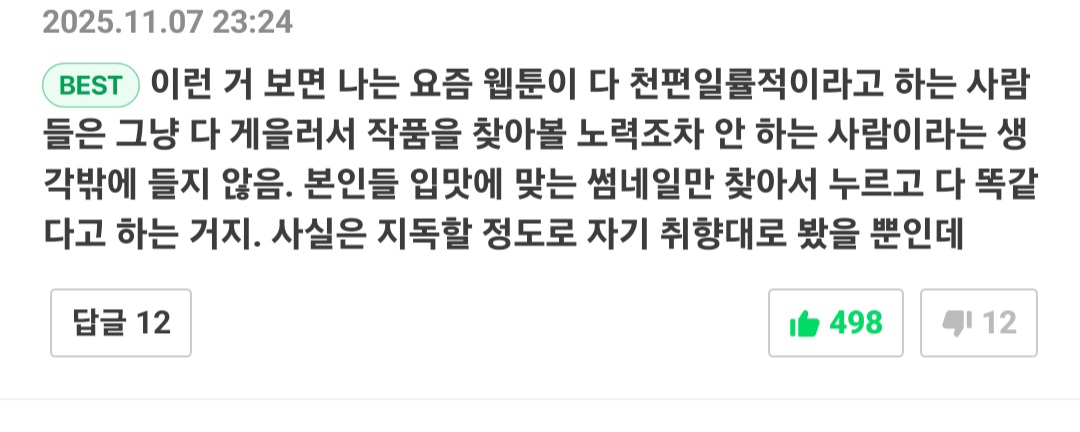 인기장르가 많은건 어느곳이든 마찬가지고, 예전보다 너무 많아져서 자기취향에 맞는걸 찾긴 힘들지만 장르의 다양성은 이전보다 곱절은 늘었다 생각함 | 25.12.14 18:14 | | |