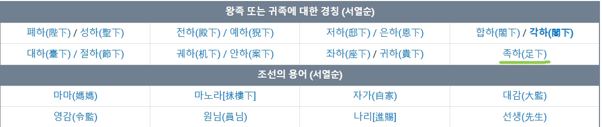 https://db.itkc.or.kr/m/dir/view?gubun=book&itemId=BT&dataId=ITKC_BT_0391A_0100_010_0150&solrQ=query%E2%80%A0%E8%B6%B3%E4%B8%8B$solr_sortField%E2%80%A0%EC%84%9C%EB%AA%85%EA%B2%80%EC%83%89_s%20%EC%9E%90%EB%A3%8CID_s$solr_sortOrder%E2%80%A0$solr_secId%E2%80%A0BT_BD$solr_toalCount%E2%80%A0395$solr_curPos%E2%80%A04$solr_solrId%E2%80%A0BD_ITKC_BT_0391A_0100_010_0150 요즘으로 치면 ##귀하 정도의 평범하게 남을 높이는 표현인데 극존칭으로 대해야 할 왕에게 저런 표현을 쓰면... 예전 어린이 만화같은 데에서는 저 표현을 '나으리'라 번역했었지. | 25.12.16 10:04 | | |