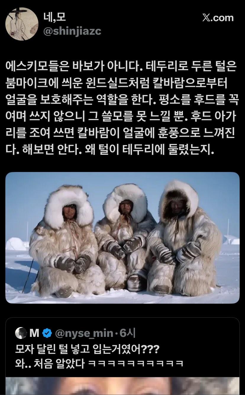 반대야 이렇게 쓰는게 기능적으로 맞음 털은 보온용이 아니라 바람을 1차적으로 막아주고 체온 덜뺏기게 해주는 용도임 | 25.12.16 10:06 | | |