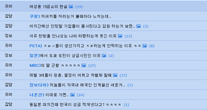 | 12710667 | 대기업이 돈 없다는게 구라인 이유.jpg (38) | 로앙군 | 134 | 17667 | 18:08 |
