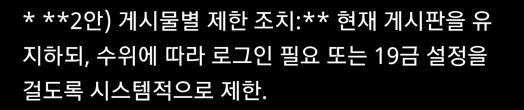 * **2안) 게시물별 제한 조치:** 현재 게시판을 유지하되, 수위에 따라 로그인 필요 또는 19금 설정을 걸도록 시스템적으로 제한.