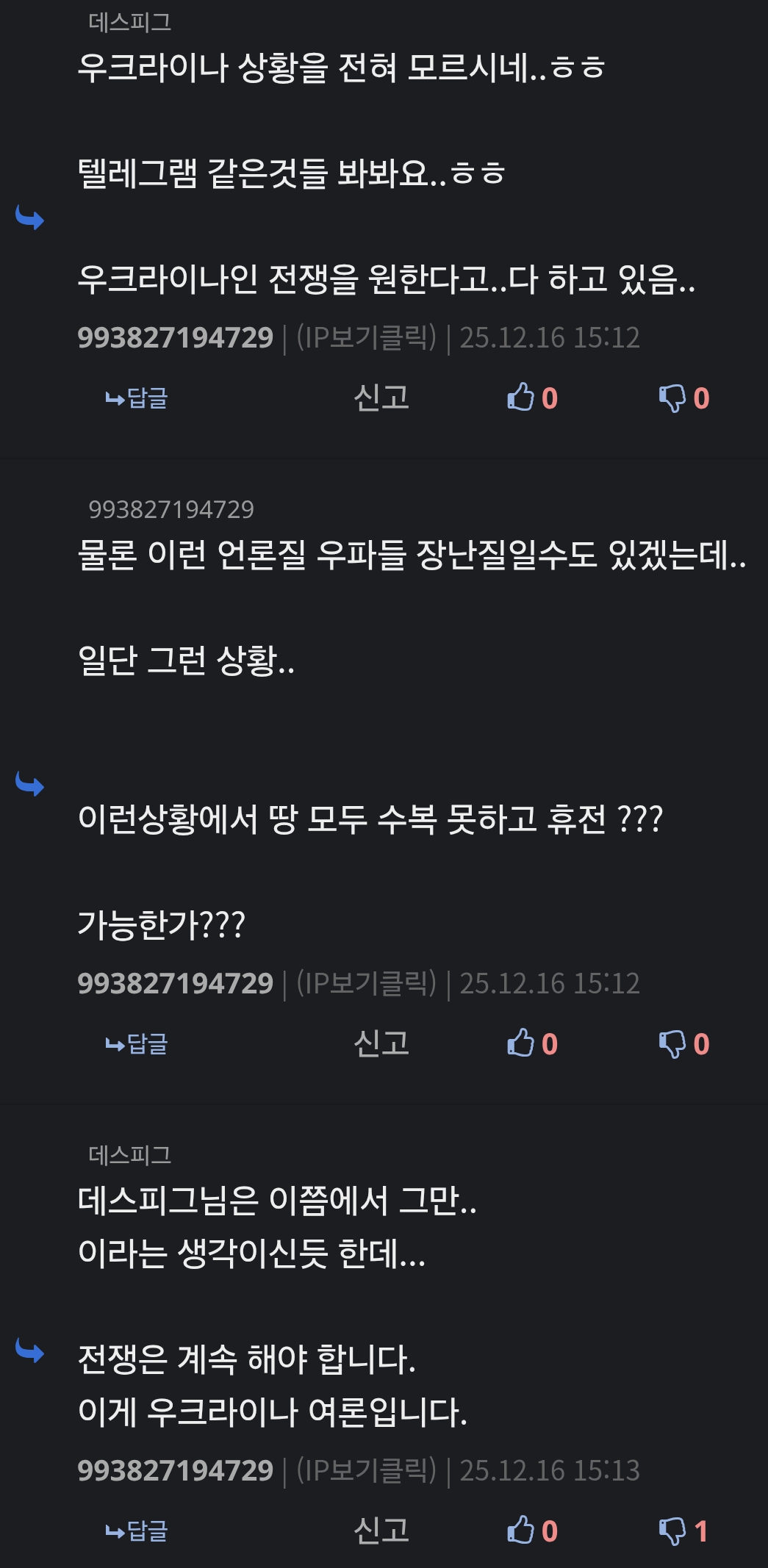 "러시아는 한국을 좋아한다"라는 이미지 때문에 국뽕러들이 러시아 빨아주더라. 우크라이나 이야기 나오면 항상 나오는 패턴이 우크라이나는 일본빨아줬으니 한국좋아하는 러시아를 지지하자는 투의 "중립적"인 (개소리같은) 러시아뽕 댓글이 심심찮게 올라옴 | 25.12.16 15:29 | | |