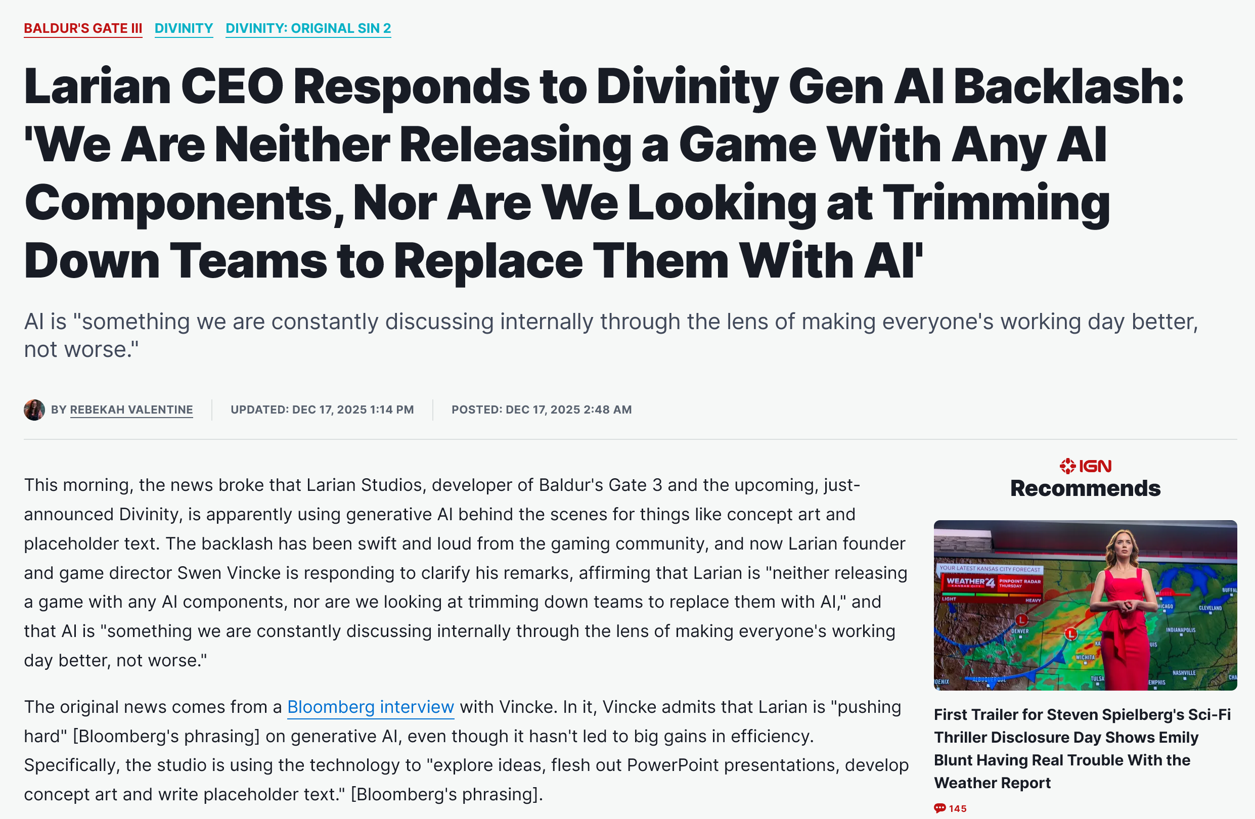 이것도 반대하면 정신병임ㅋㅋ 게임사도 지능 있는 곳은 무지성 딸깍 안 함 다 걸림+걸리면 매출에 손실이 남+지금 당장 아트인력 해고할 수도 없음. 인건비는 아직 감소하기전인데 ai쓰다가 매출 손실나면 멍청한 거임. 뭐? 그런 회사가 있다고? 카오스 맙소사 | 25.12.17 18:13 | | |