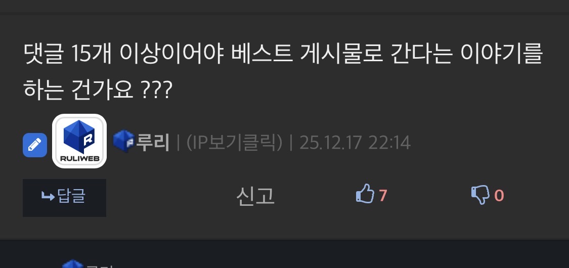베스트댓글 기능이 활성화되려면 게시글의 댓글이 15개가 넘어야하는게 잠수함 패치됨 유게 불타고 루리 운영자님이 이제서야 상황파악중 | 25.12.17 22:22 | | |