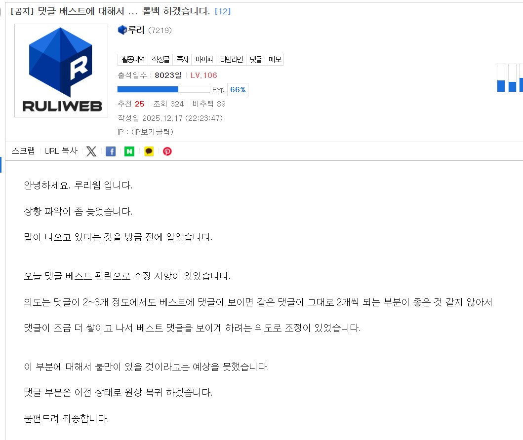 이걸로 문제될지 몰랐다가 갑자기 베글에 다 드러누워있으니까 왜 불난거임? 하는거지 | 25.12.17 22:36 | | |