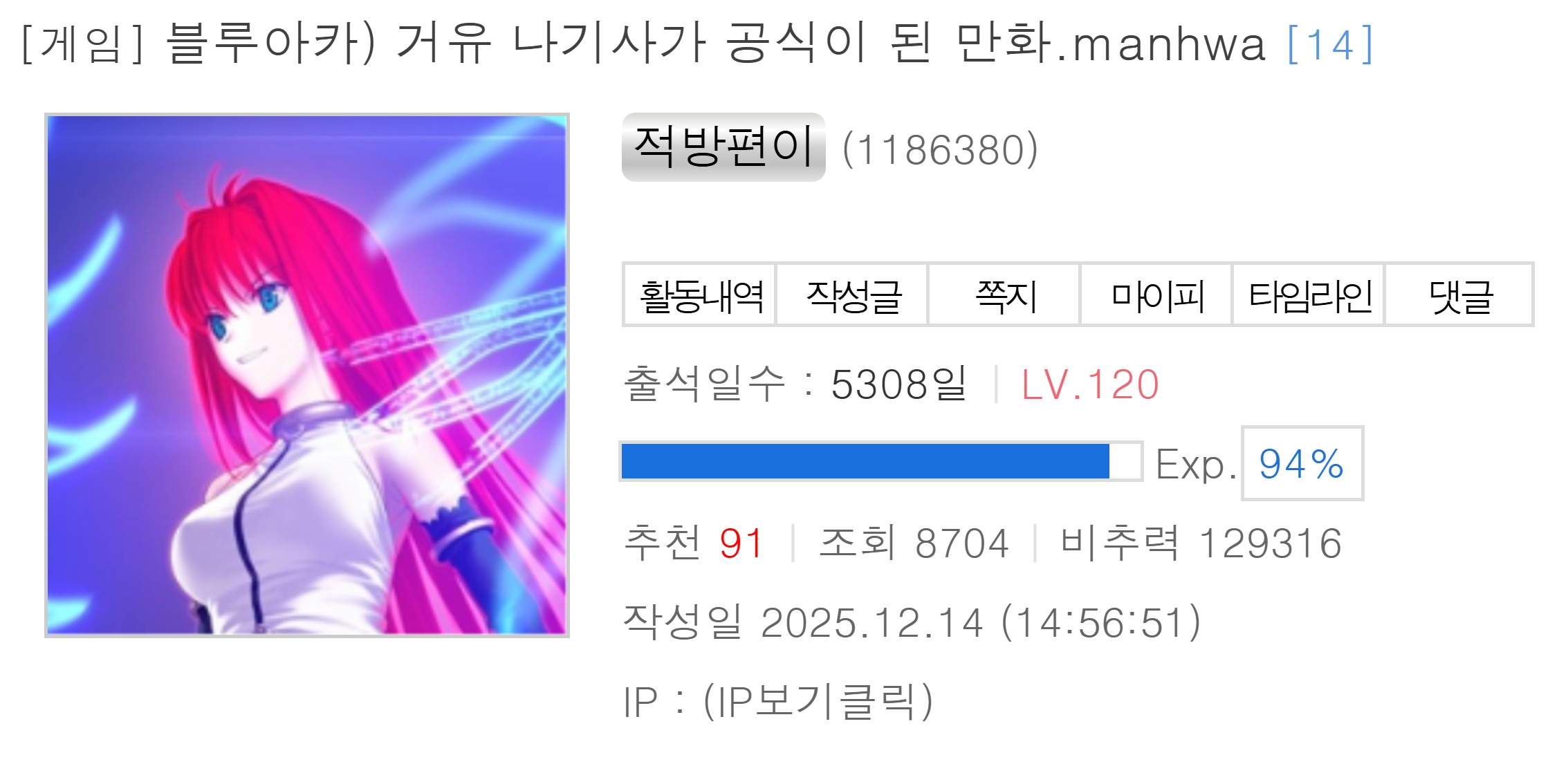 아니 어그로 글 베댓이라는게 글 자체 어그로인것도ㅠ있는데 베댓 여론에 휘둘리는 경우를 얘기하는거임 단순히 선점했다고 다 좋은데 아니라 | 25.12.17 22:45 | | |