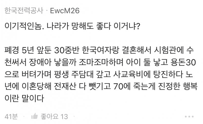 흔히 결혼 안하거나 못하는 사람들 보고 결혼 안하면 늙어서 고독사 한다 그러는데 현실은 결혼해서 자식, 손주까지 있어도 안돌보면 고독사 못피하는데 그건 이 악물고 아무 얘기 안하더라 | 25.12.18 02:41 | | |